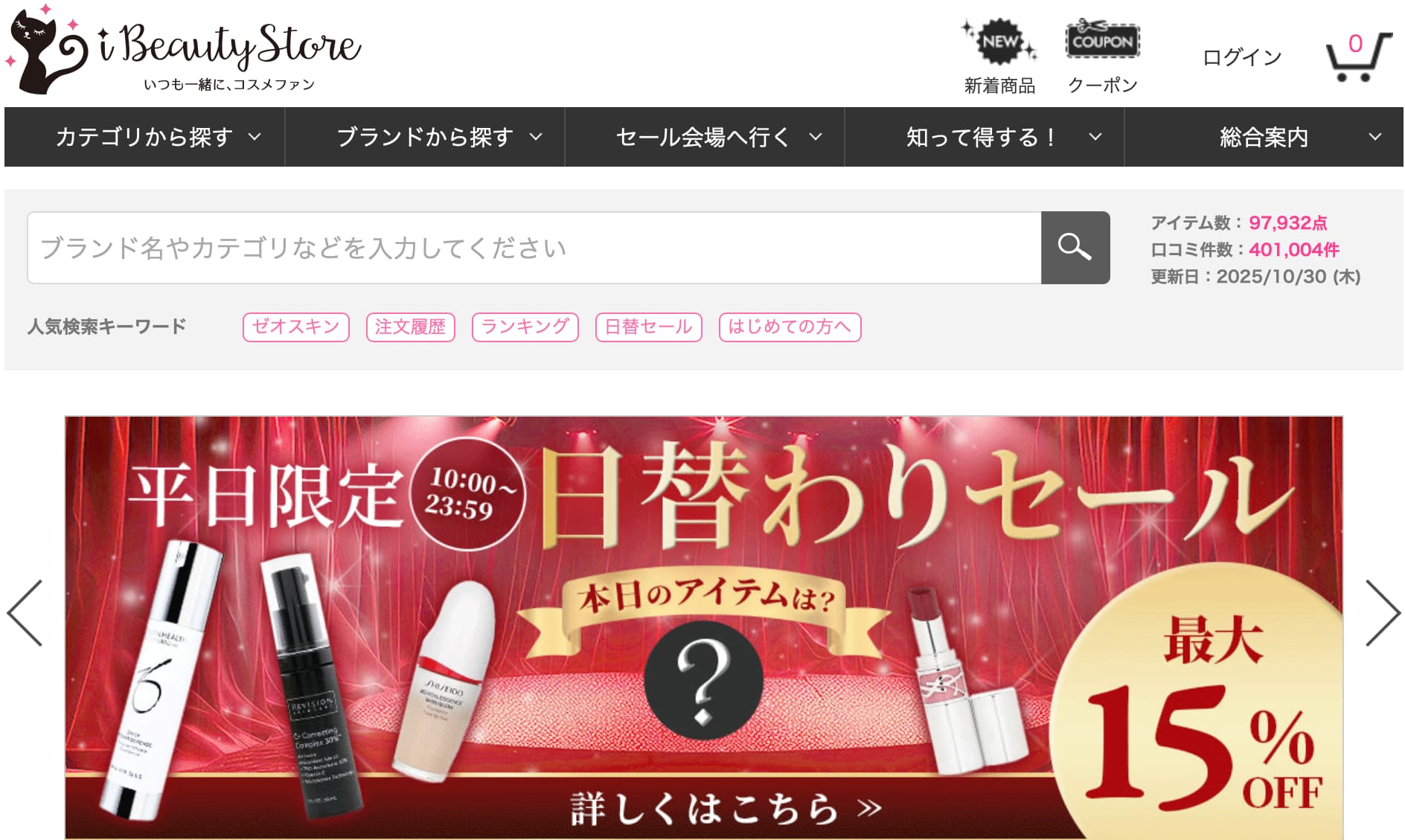 平日限定で日替わりセールを行なっていて人気ブランドコスメが最大15%OFFのお得な価格で買えます!